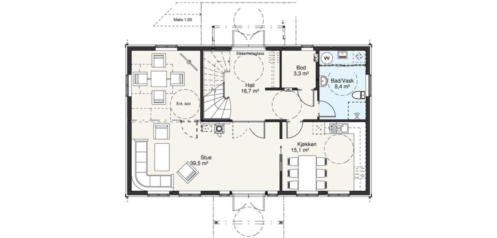Med Mesterhus Karita har arkitekten lagt vekt på å skape et harmonisk og tidløst fasadeuttrykk. Den midtsentrerte balkongen og et overbygd inngangsparti er med på å gi huset en herskapelig stil. Den romslige hallen med trapp opp til andreetasje og doble dører inn til stua, gir et flott inntrykk når du eller dine gjester kommer inn i huset. Det er også praktisk med god plass der hele familien kommer inn, med en romslig bod, bad og vaskerom lett tilgjengelig.