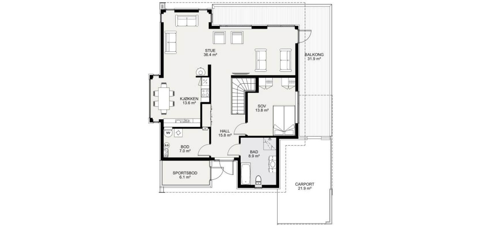 Signatur 306 er tilpasset skrå tomt, og hovedinngangen ligger på øvre plan, med kort vei til carporten. Rett ved siden av inngangen har du direkte adkomst til en utvendig sportsbod. Huset har også en stor, flott terrasse tilgjengelig fra stuen.