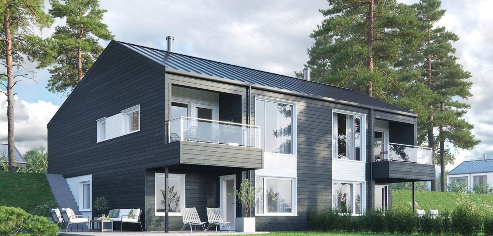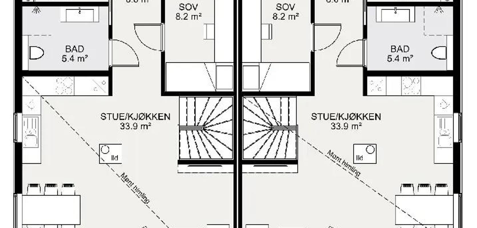 Begge boenhetene er speilvendte og har skjermede balkonger på hver side. I tillegg har hver enhet sitt eget herlige, private uteområde på bakkeplan. En annen fordel er at huset er spesialtilpasset for en skrå tomt, slik at du kan få inngang i begge etasjene.